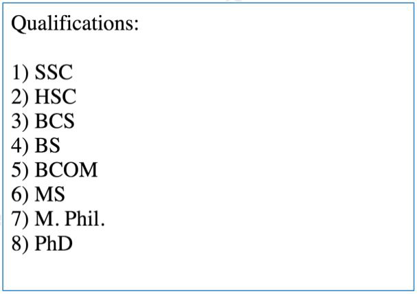 BCS, BS, BCOM, MS, M. Phil., PhD). Show the listed qualifications in your browser like: