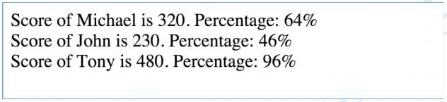 Assume that total marks are 500 for each student, display the scores & percentages of students like: