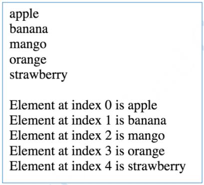 fruits = [“apple”, “banana”, “mango”, “orange”, “strawberry”]