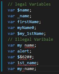 a) A heading stating “Rules for naming JS variables”